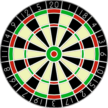 The score of a dart is determined by the number of the region that the dart lands in. A dart landing outside the red/green outer ring scores zero. The black and cream regions inside this ring represent single scores. However, the red/green outer ring and middle ring score double and treble scores respectively.