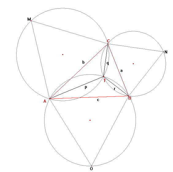 Torricelli was able to prove that if equilateral triangles AOB, BNC and AMC are constructed on each side of triangle ABC, the circumscribed circles of AOB, BNC, and AMC will intersect at a single point, T, inside the triangle. Moreover he proved that T, called the Torricelli/Fermat point, minimises p + q + r. Even more remarkable, it can be shown that when the sum is minimised, AN = BM = CO = p + q + r and that AN, BM and CO also intersect at T.